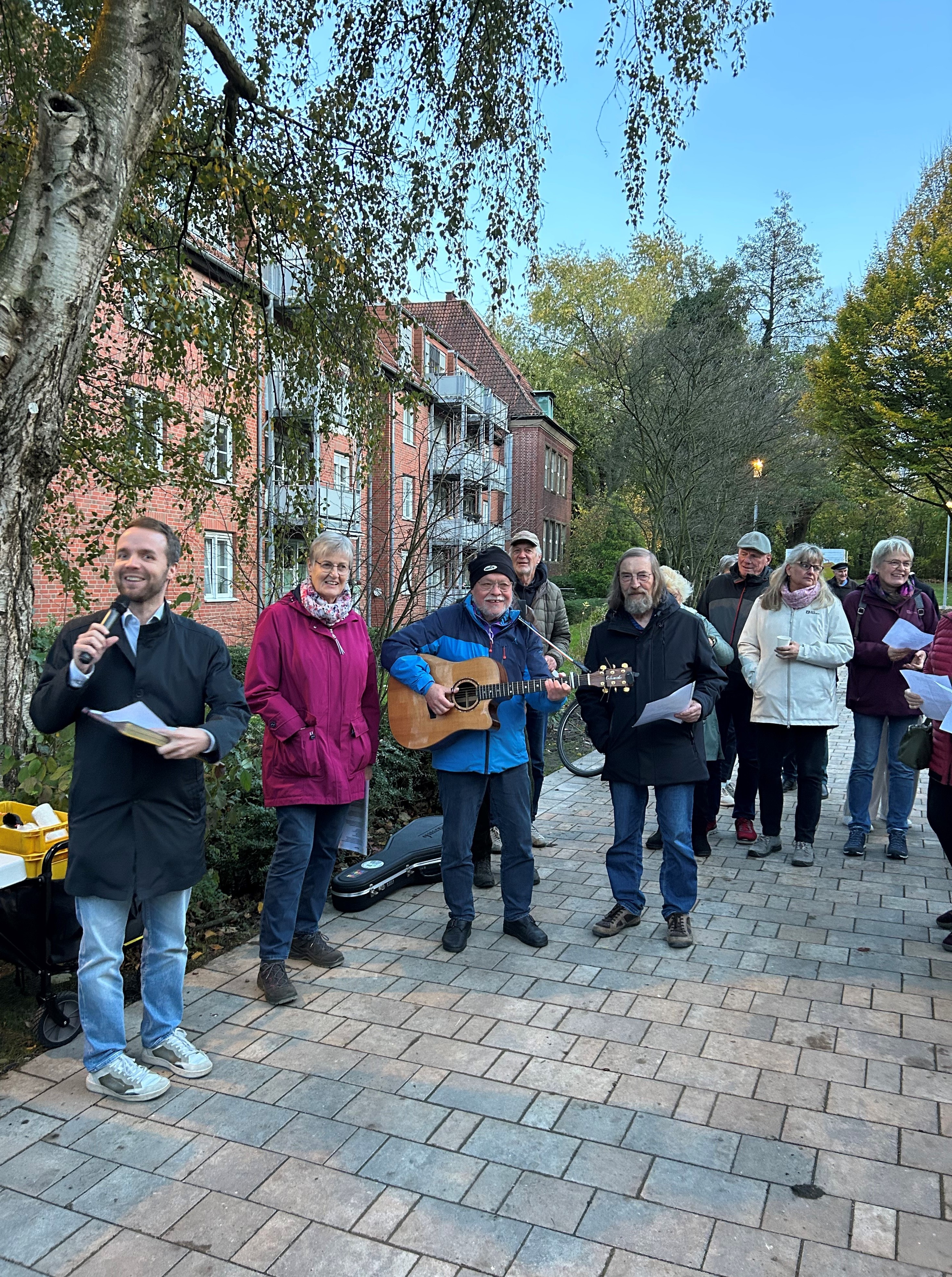 Die Gruppe "Unerhört" und weitere Bewohner:innen des Generationenwohnens Am Stutenteich 3 hatten Liedtexte und Instrumente mitgebracht und schmetterten zusammen mit den Anwesenden das Lied "Miteinander“. Eine kurze Besichtigungsrunde durch den Park schloss sich an. An der „orangefarbenen Bank“ erläuterte Gleichstellungsbeauftragte Mareike Berweger, was es mit dieser Bank auf sich hat: Die Bank sensibilisiert für das Thema „Gewalt gegen Frauen“ und macht auf Hilfs- und Unterstützungsangebote aufmerksam.